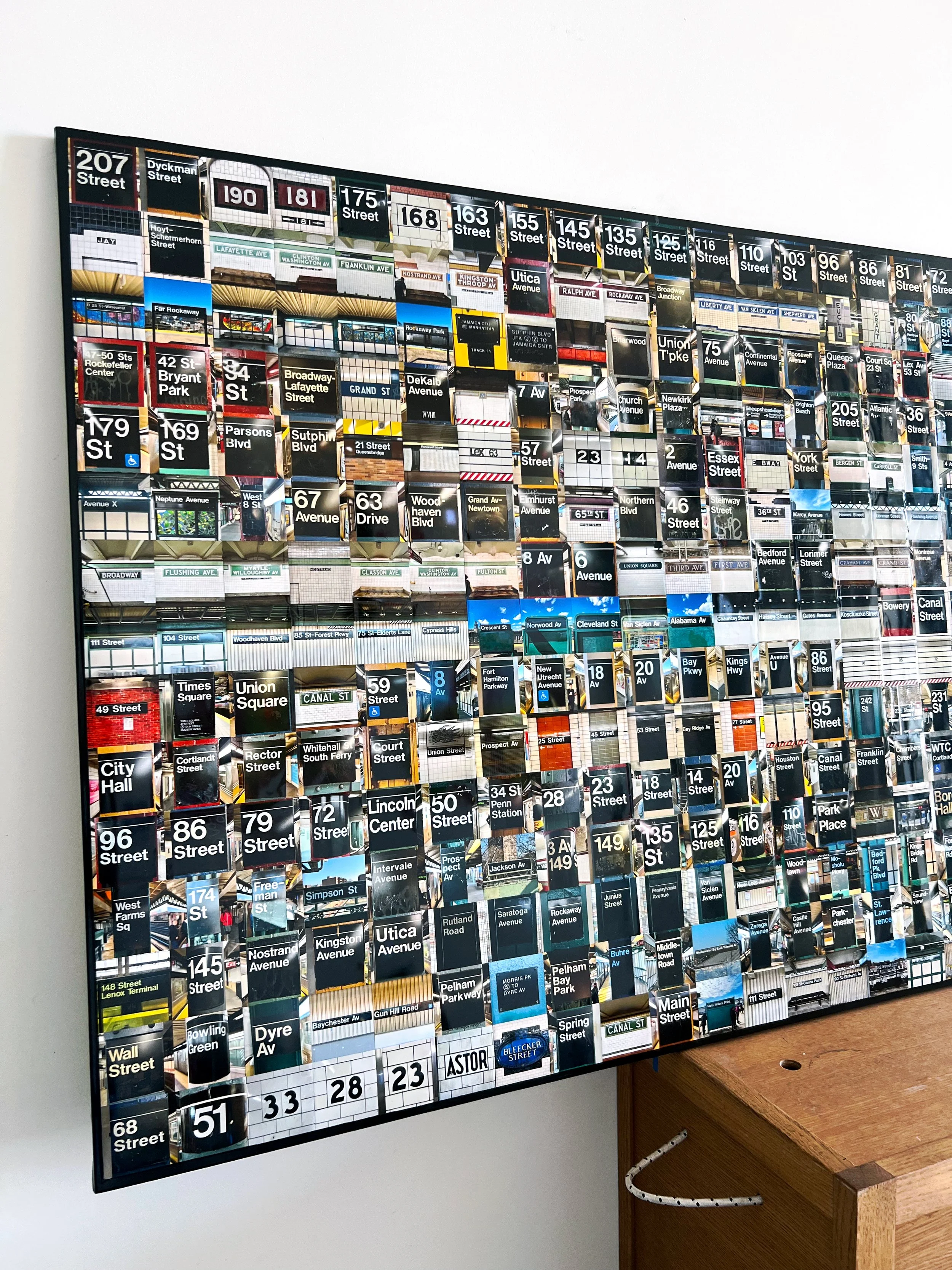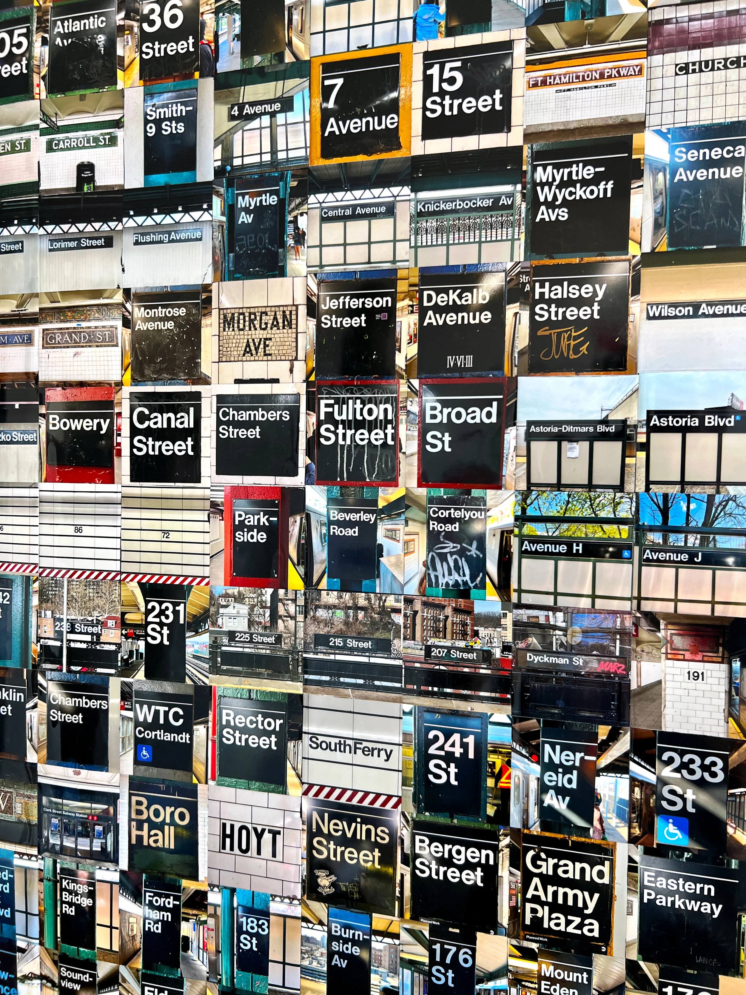 Mixed media collage with photographs of the name plates of 448 stations* of the New York City subway system.