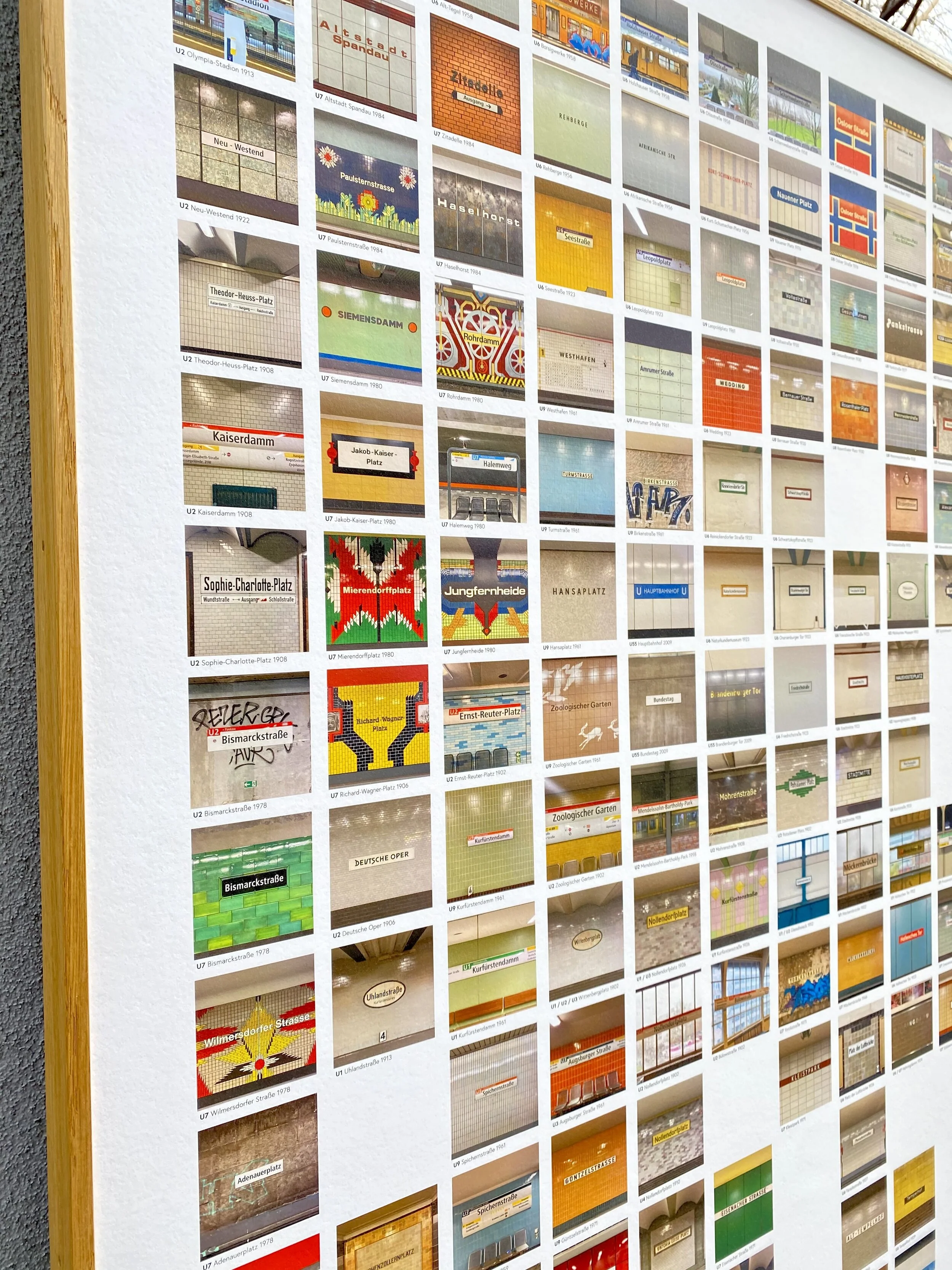 Print with composition of the signs of all 173 stations of the Berlin metro, arranged by their geographic location, forming an alternative map of the Berlin Metro system.