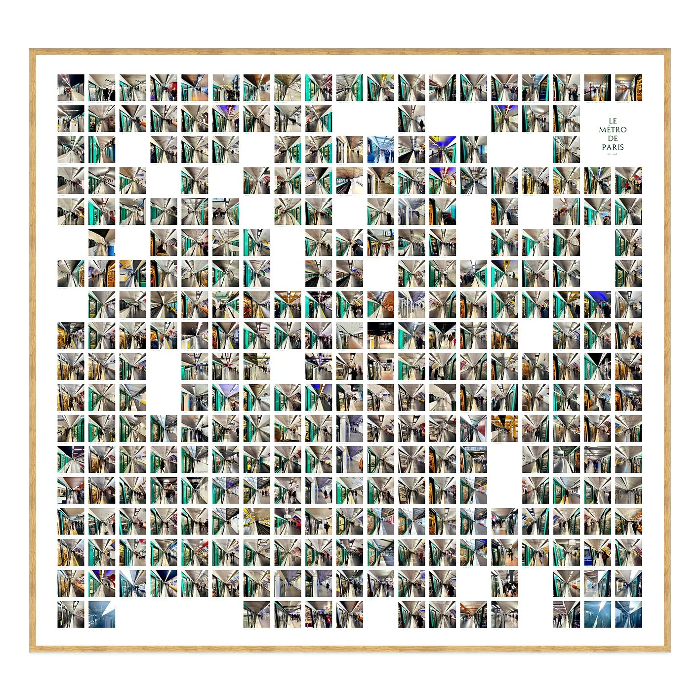 Print with composition of the signs of all 302 stations of the Paris metro, arranged by their geographic location, forming an alternative map of the Paris Metro system.