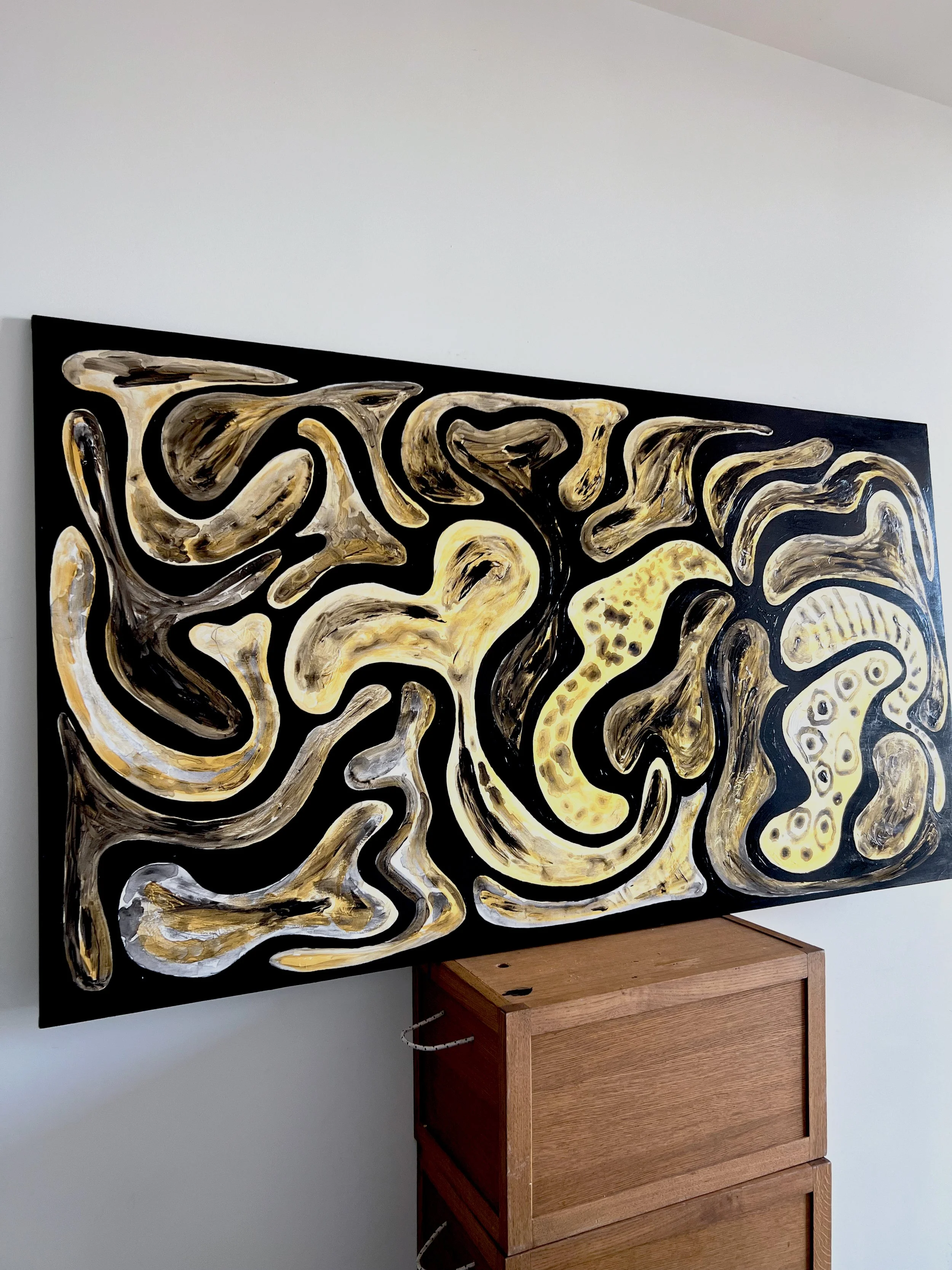Acrylics, black gesso and varnish on DB cotton canvas.