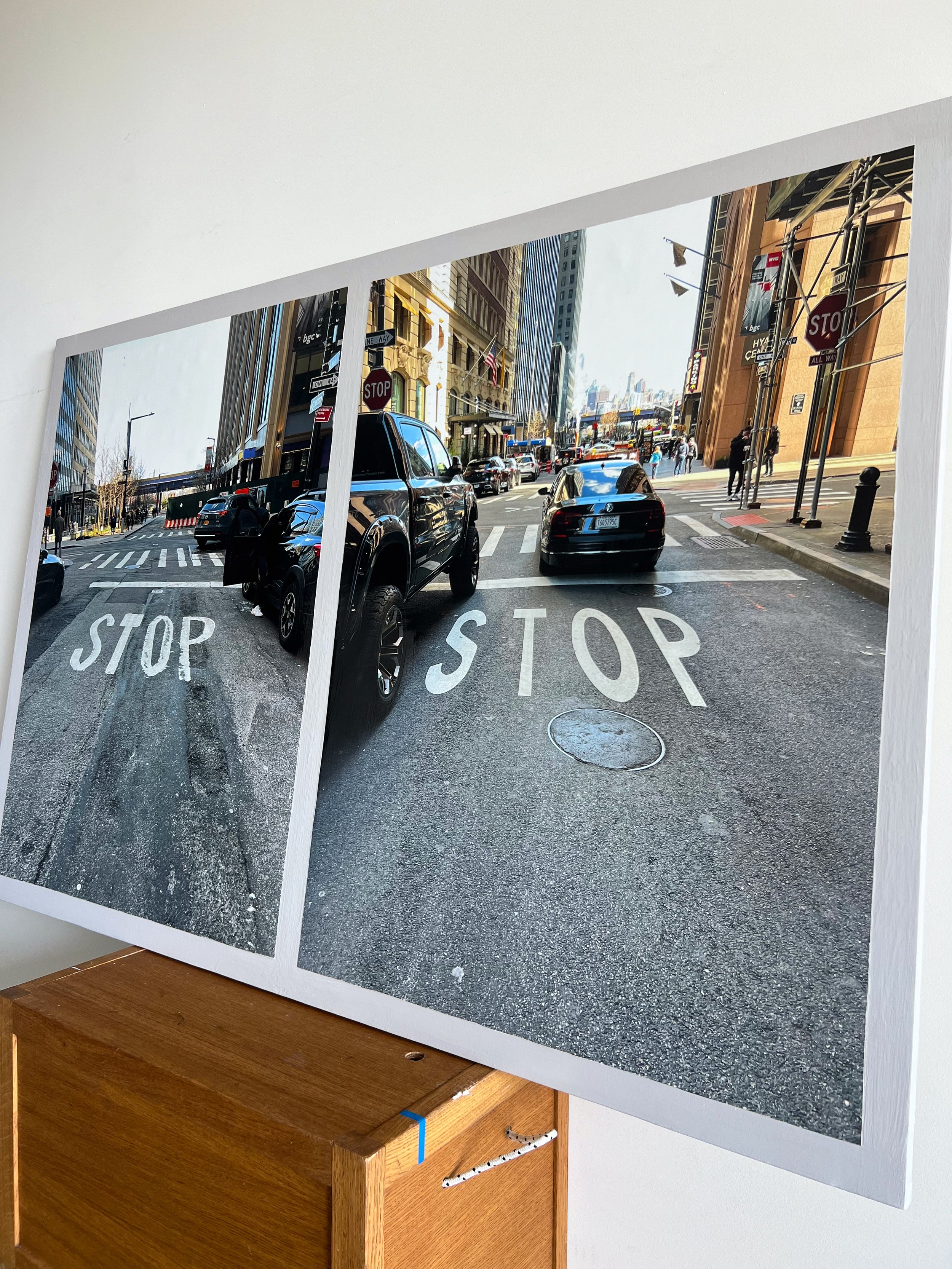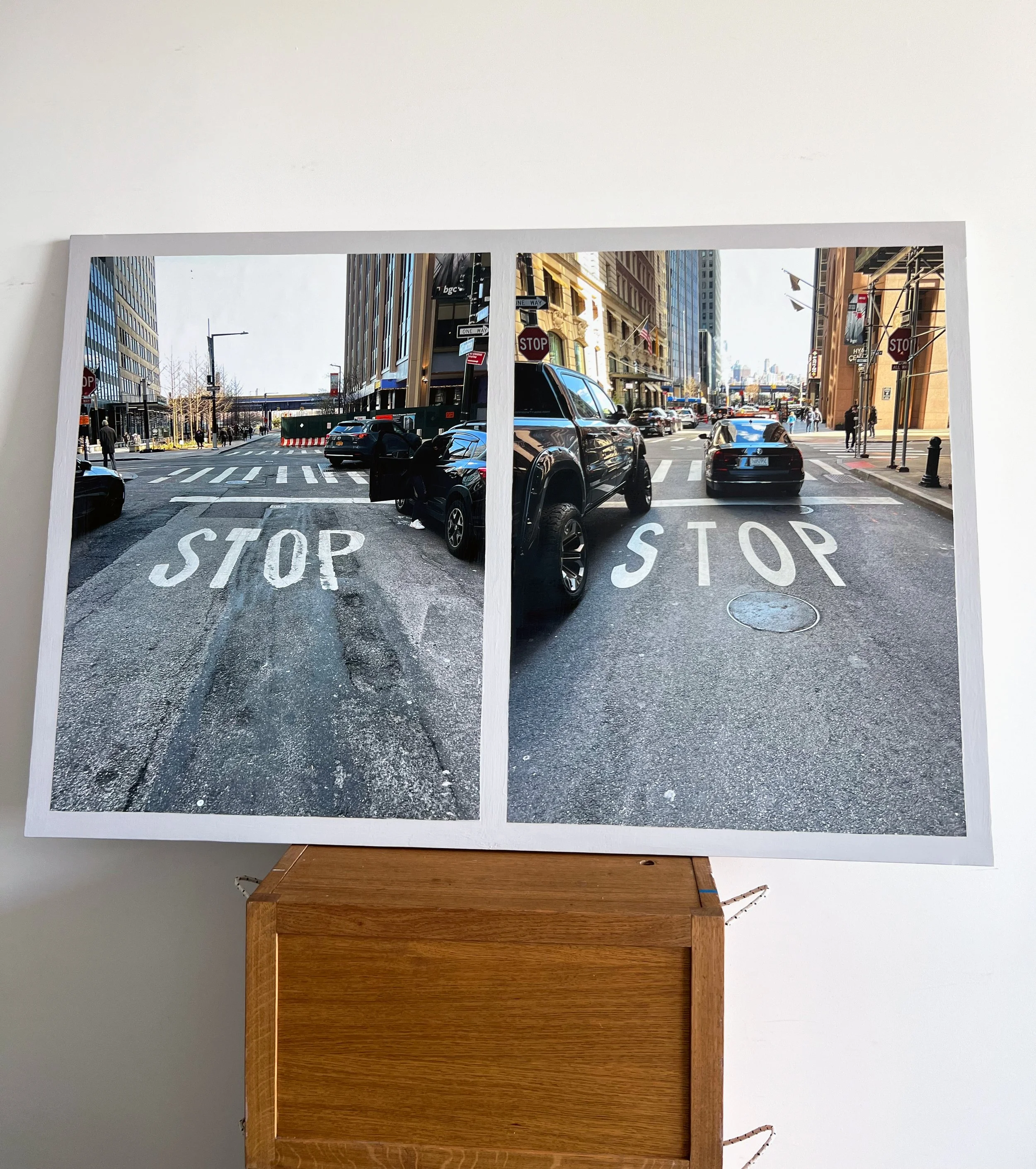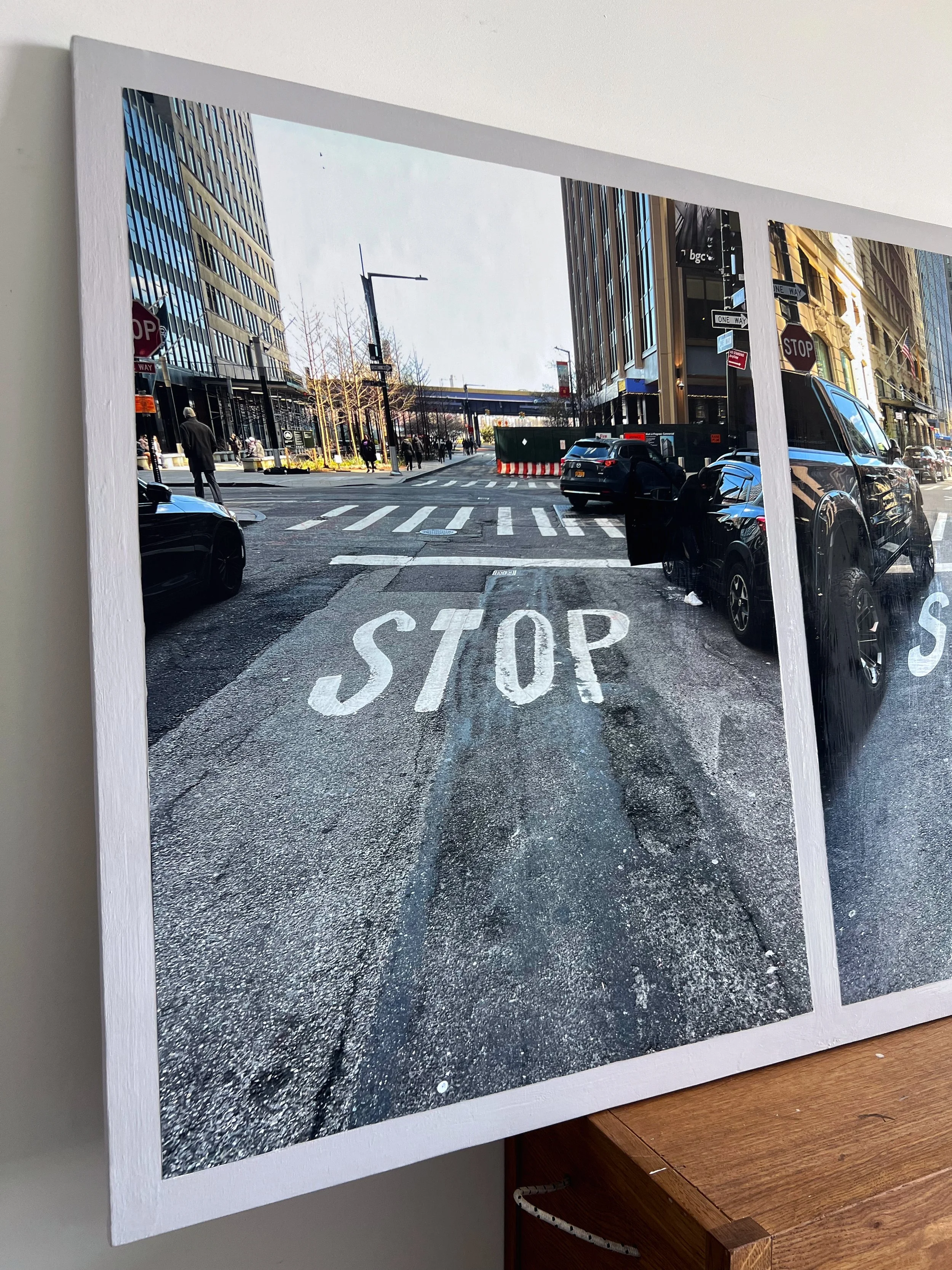 Mixed media collage with 2 photographs of the stop signs on Wall Street.